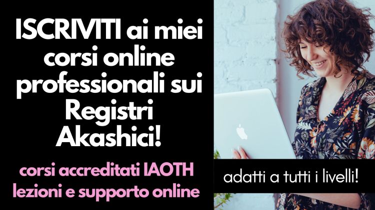 - Se il corso ti è piaciuto e vuoi diventare un lettore di Registri Akashici professionale, iscriviti al mio CORSO “Come leggere i Registri Akashici per l’evoluzione dell’anima” – PARTE 1 – CLICCA QUI.